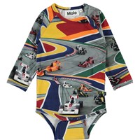 Field is a long sleeve baby bodysuit with an all-over print of race cars. It has easy snap closure at the neck and crotch.