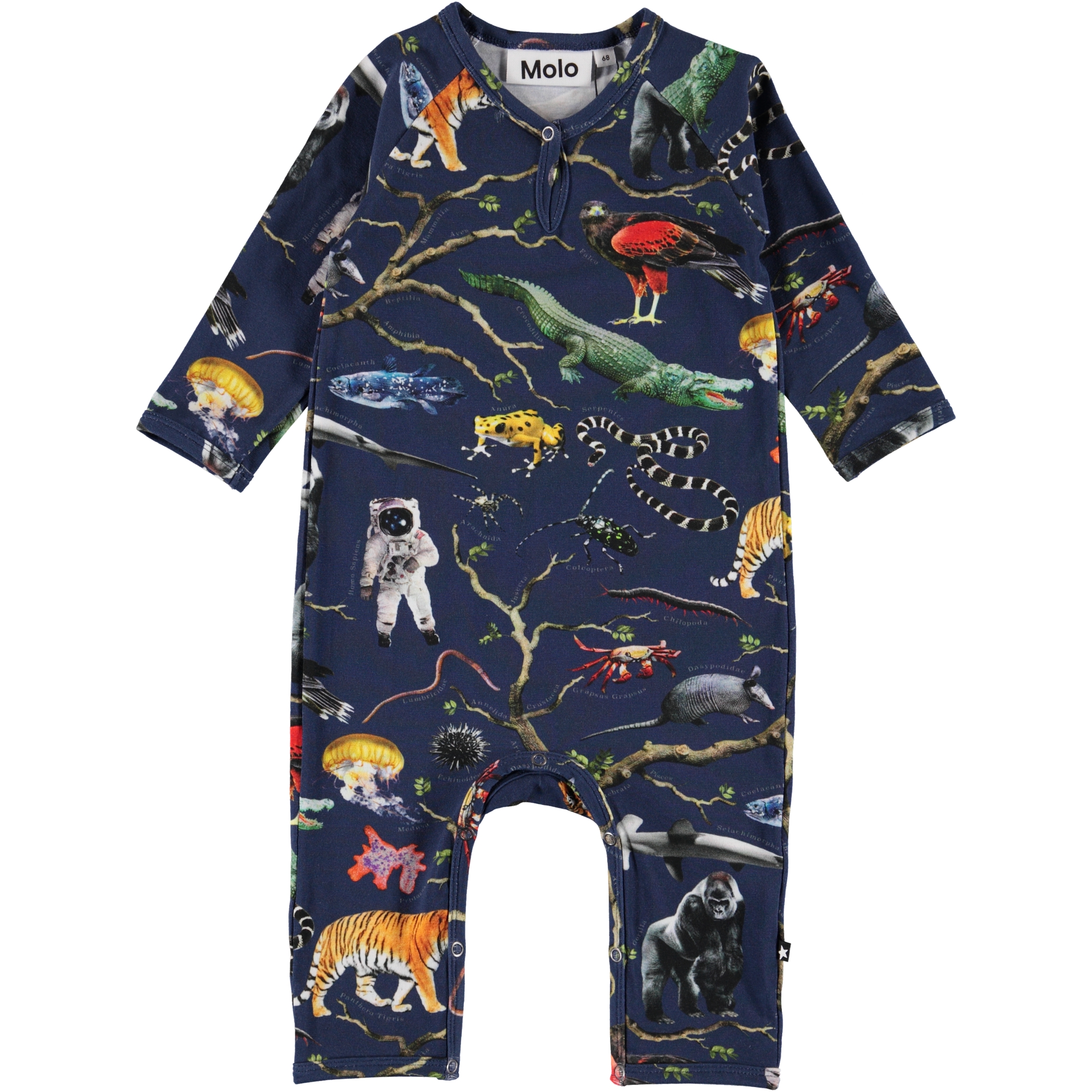 Explpore the 'Tree of Life' on the long sleeve Fleming baby bodysuit. There are aliens and wild animals hidden in the print. It has easy snap closure at the neck and crotch.