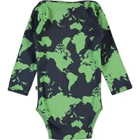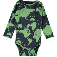 Foss is a long sleeve baby bodysuit in blue and green with a print of a map of the world. It has easy snap closure at the neck and crotch.