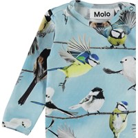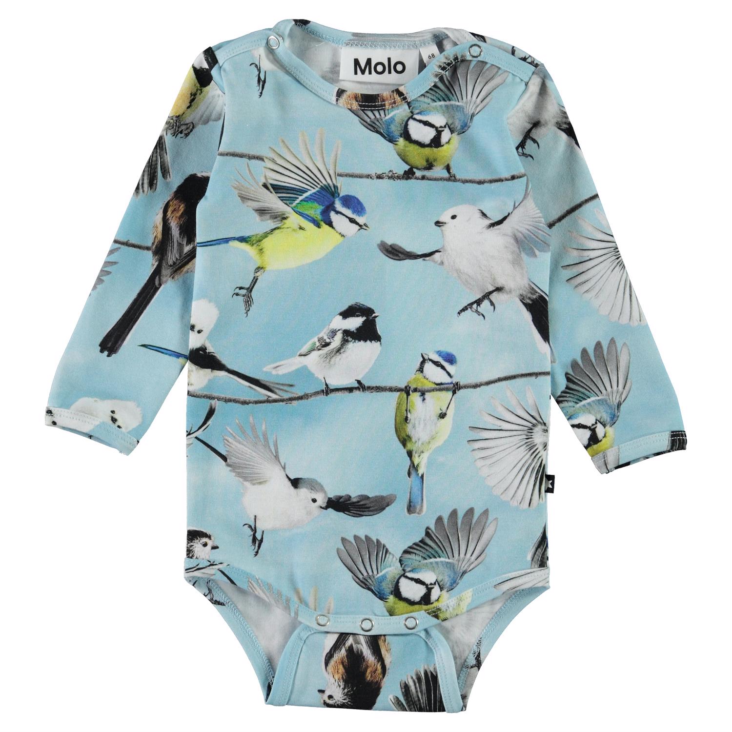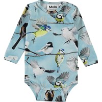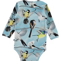 Foss is a long sleeve baby bodysuit in light blue with a print of small birds. It has easy snap closure at the neck and crotch.