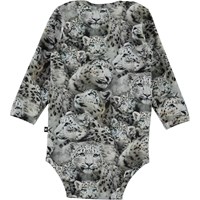 Foss is a long sleeve baby bodysuit in grey with a snow leopard print. It has easy snap closure at the neck and crotch.