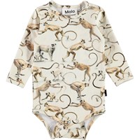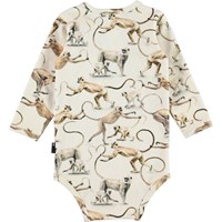 Foss is a cream coloured baby bodysuit with a print of monkeys holding each other's tails. Can you spot the heart? Foss has an easy snap closure at the collar and between the legs for quick changes.