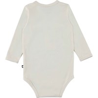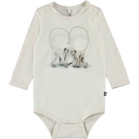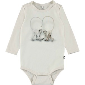 Foss is a white baby bodysuit with a print of monkeys whose tails form a heart. Foss has an easy snap closure at the collar and between the legs for quick changes.