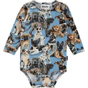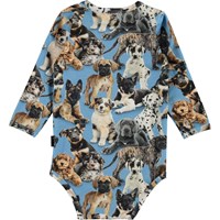 Foss is a blue baby bodysuit with a puppy print. Wear it with matching trousers. Foss has an easy snap closure at the collar and between the legs for quick changes.