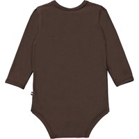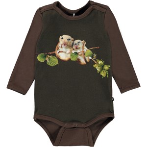 Foss is a dark brown baby bodysuit with a print of small mice that are sitting on a branch. Foss has an easy snap closure at the neck and between the legs.