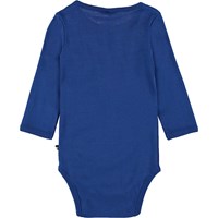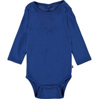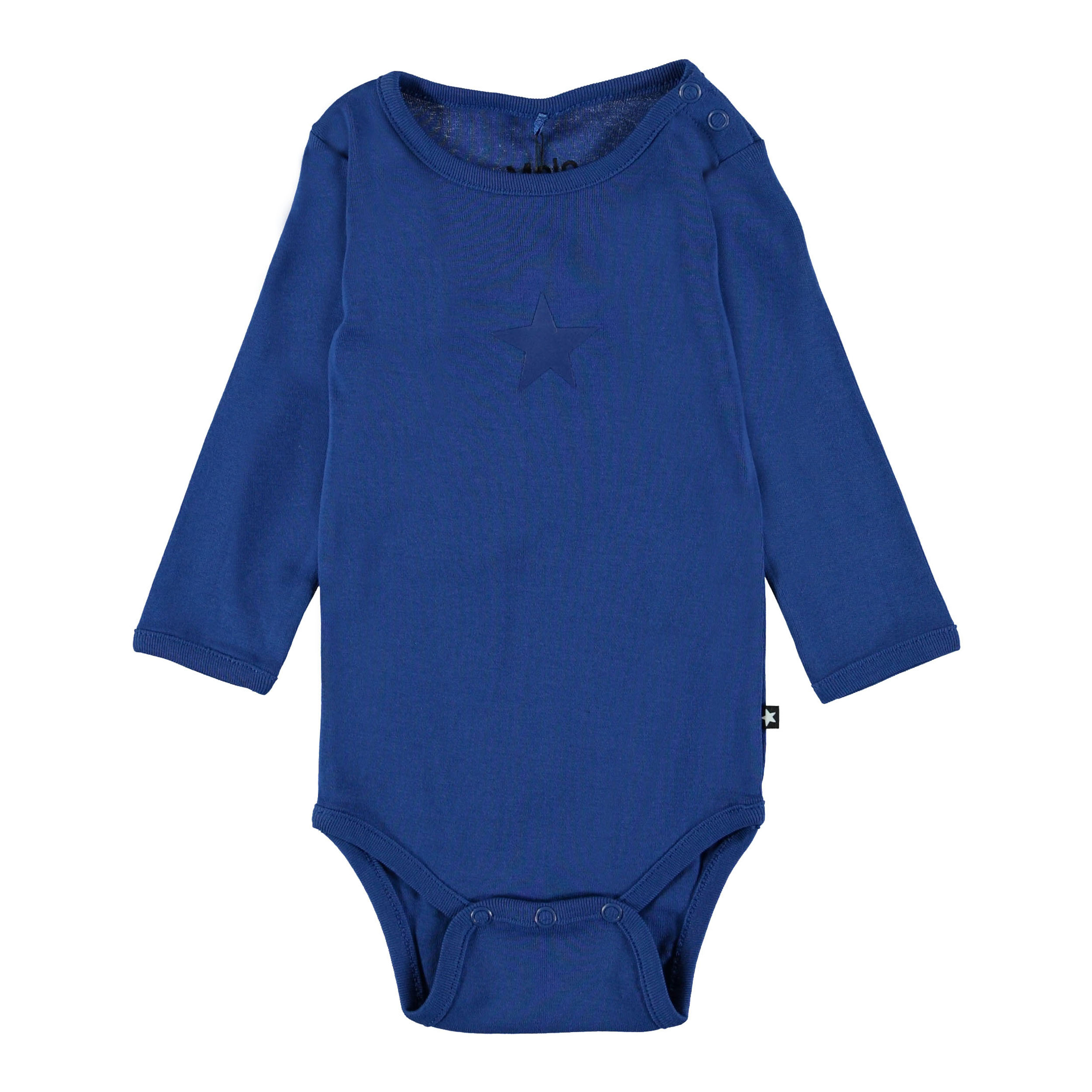Foss is a long sleeve baby bodysuit in blue with a star on the front. It has an easy snap closure at the neck and crotch.