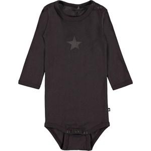 Foss is a long sleeve baby bodysuit in dark brown with a star on the front. It has an easy snap closure at the neck and at the crotch.