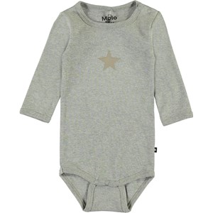 Foss is a long sleeve baby bodysuit in light grey with a star on the front. It has an easy snap closure at the neck and at the crotch.