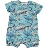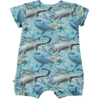 From is a blue baby bodysuit in 100% organic cotton jersey. The bodysuit has short sleeves and legs and is in the Ancient Ocean all over print, which shows sharks, octopus and prehistoric aquatic dinosaurs swimming around. From has an easy snap closure on one shoulder and between the legs.