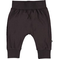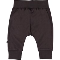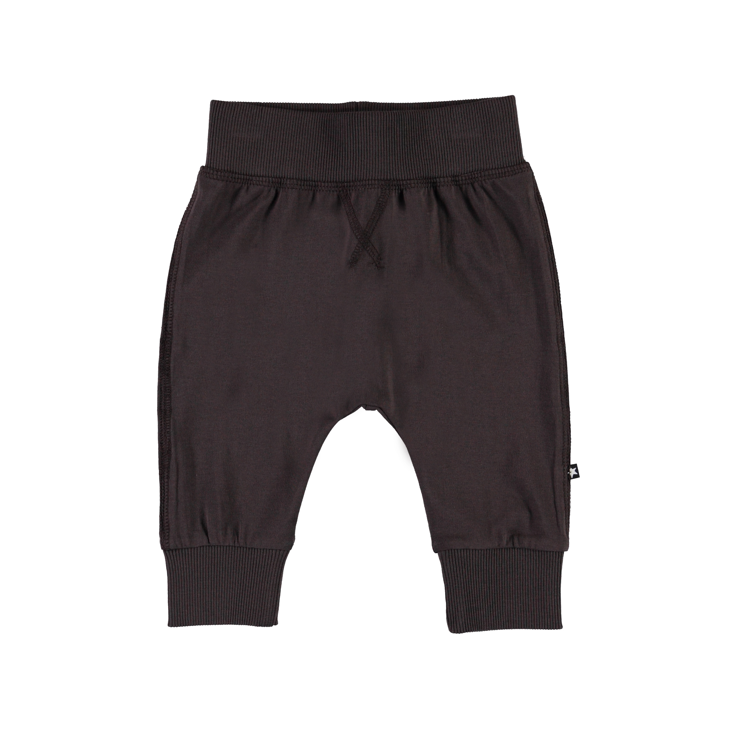 Sammy is a pair of dark brown baby trousers. They have wide elastic rib at the waist and legs as well as visible stitching on the front for a sweatpant look.