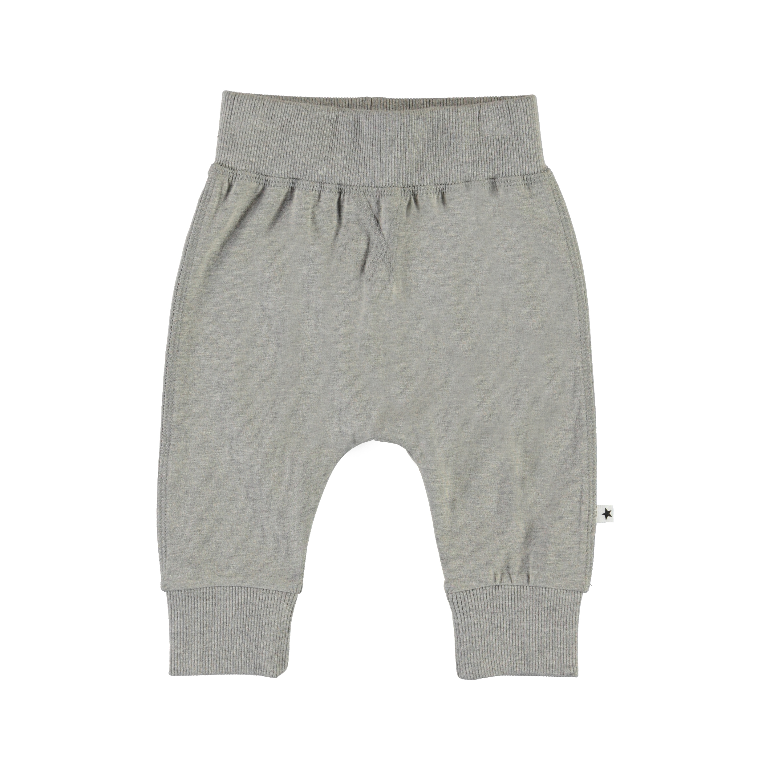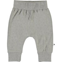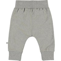 Sammy is a pair of grey baby trousers. They have wide elastic rib at the waist and legs as well as visible stitching on the front for a sweatpant look.