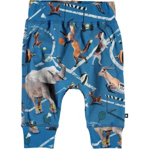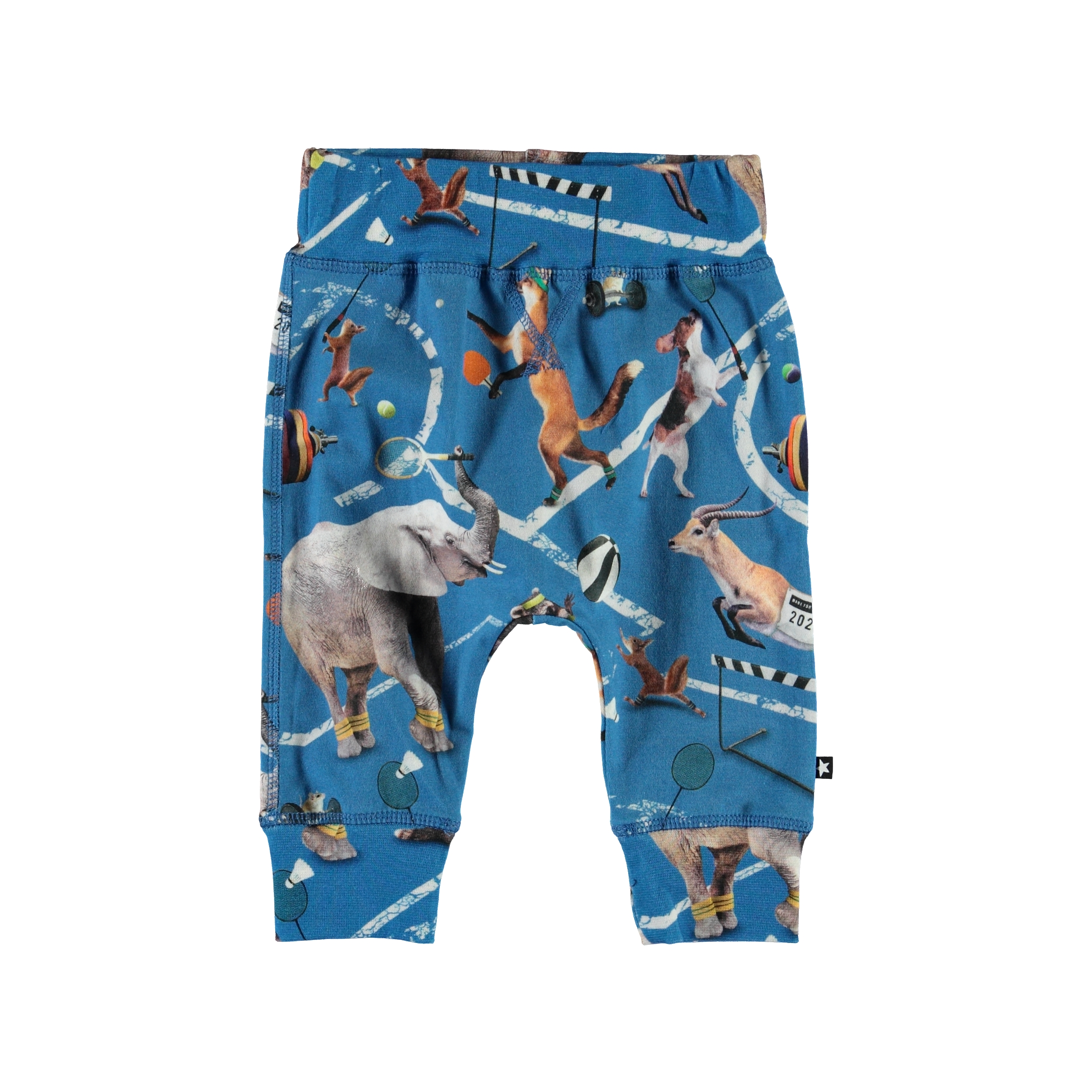 Sammy is a pair of light blue baby trousers with a print of various animals engaged in sports. They have wide elastic rib at the waist and legs as well as visible stitching on the front for a sweatpant look.