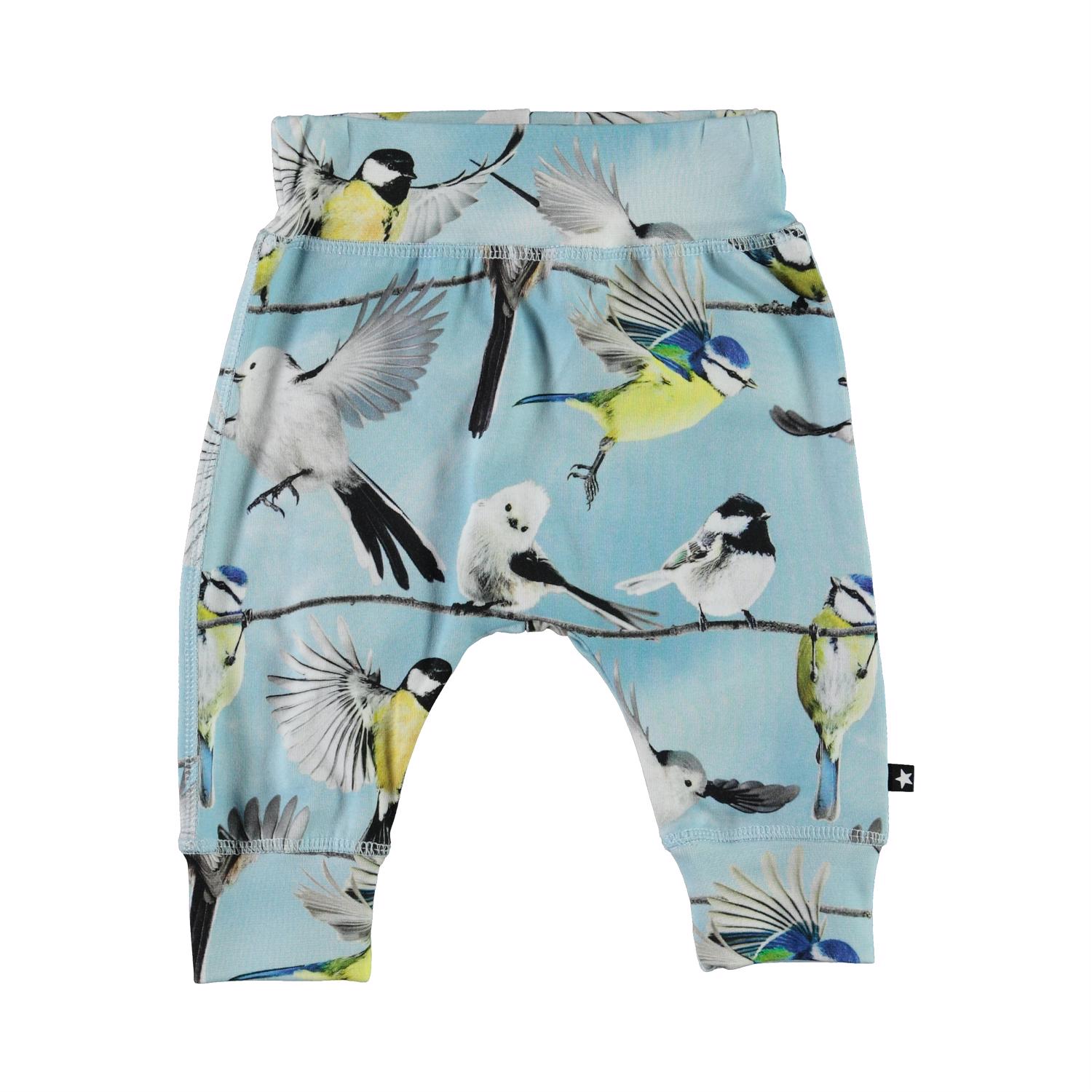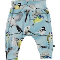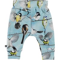 Sammy is a pair of light blue baby trousers with a print of small birds. They have a wide elastic rib at the waist and legs and visible stitching in the front that gives them a sweatpants look.