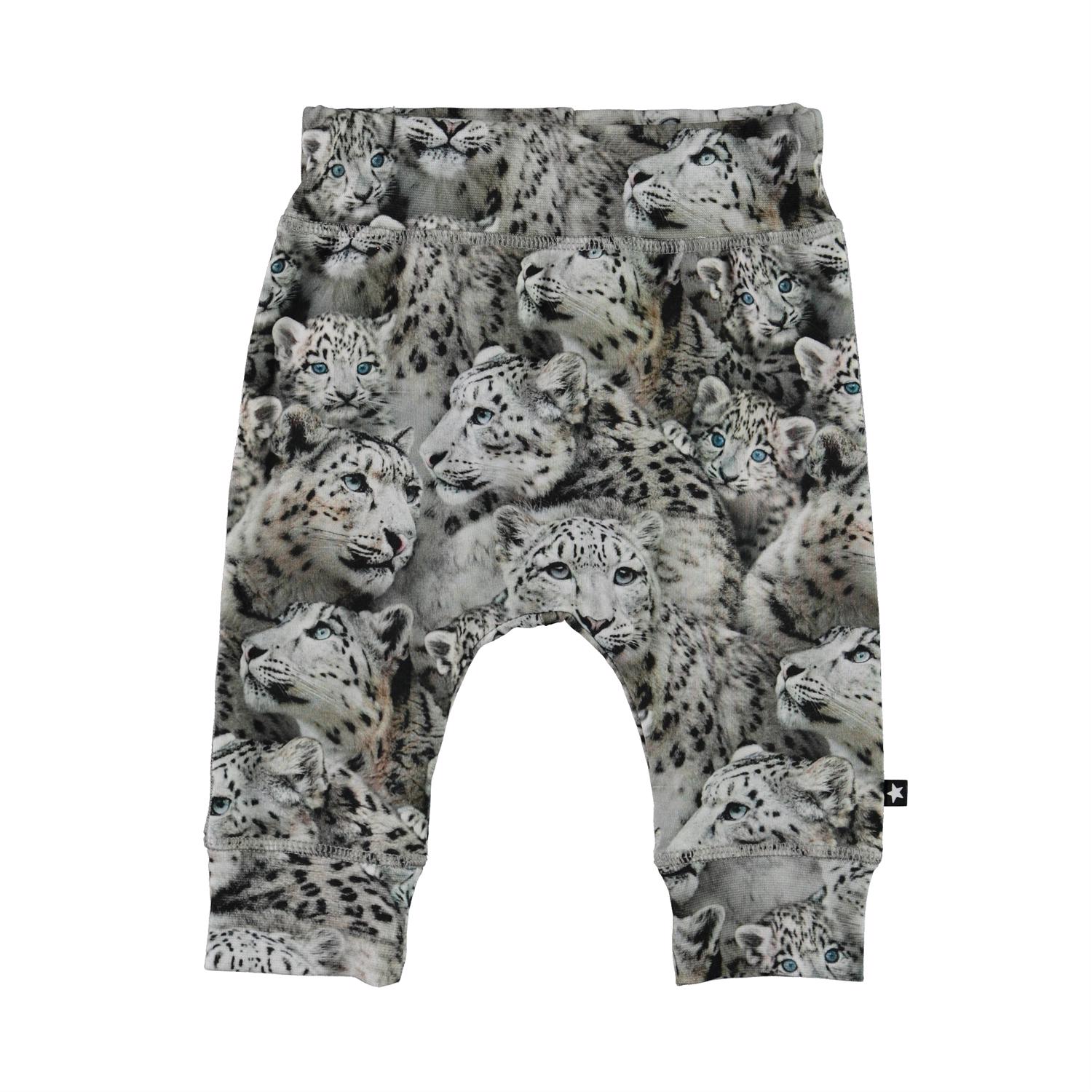 Sammy is pair of grey baby trousers with a print of snow leopards. They have a wide elastic rib at the waist and legs and visible stitching in the front that gives them a sweatpants look.