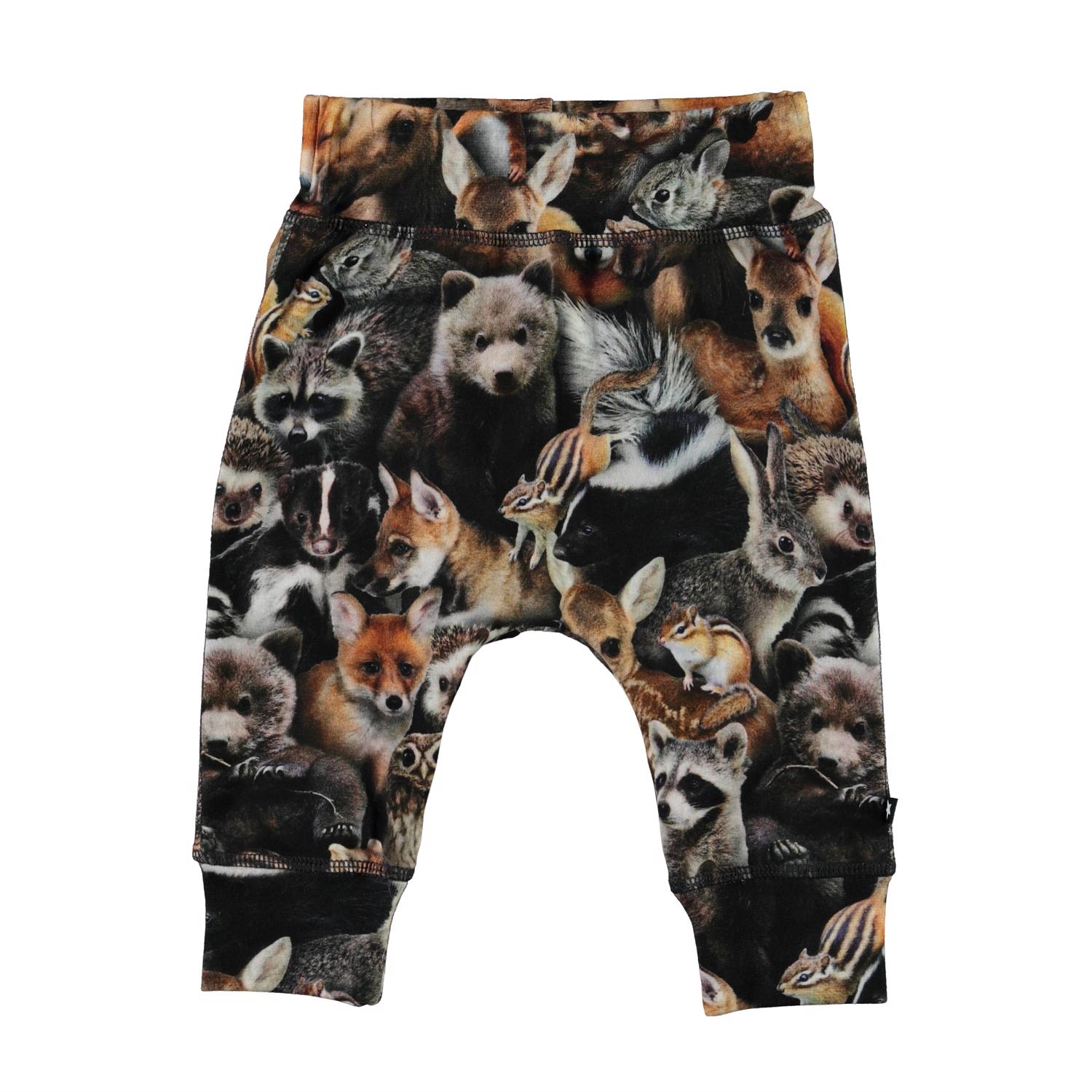 Sammy is a pair of brown baby trousers with a print of animals of the forest. They have a wide elastic rib at the waist and legs and visible stitching in the front that gives them a sweatpants look.