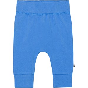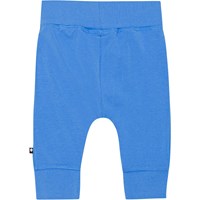 Blue baby trousers in organic cotton jersey. They have a wide, elastic rib at the waist and legs as well as visible stitching on the front, which gives them a sweatpants look. The trousers are roomy and easy to move around in.