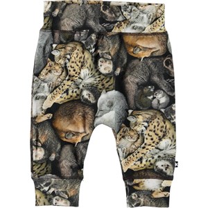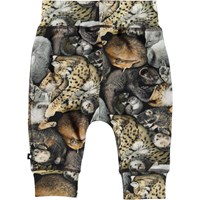 Sammy is a pair of pull on baby trousers with a print of various animals that are hibernating. They have a wide elastic rib at the waist and legs as well as visible stitching on the front that gives them a sweatpants look.