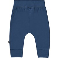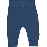 Sammy is a pair of dark blue baby trousers in 100% organic cotton jersey. They have a wide elastic rib at the waist and legs, which gives them a comfortable fit.