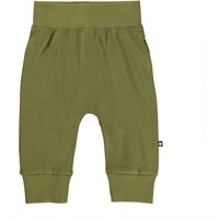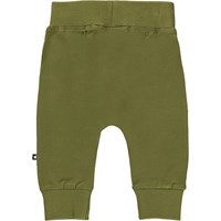 Sammy is a pair of green baby trousers. They have wide elastic rib at the waist and the legs. The trousers have visible stitching on the front, which creates a sweatpants look.