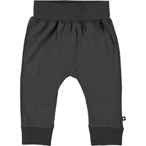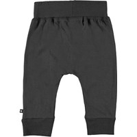 Sammy is a pair of grey baby trousers. They have a wide elastic rib at the waist and legs and visible stitching in the front that gives them a sweatpants look.