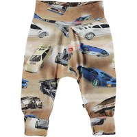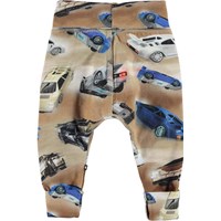 San Is a pair of organic baby trousers with a race car print. They have wide, folded elastic at the waist and legs.