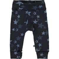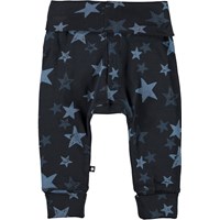 San is a pair of dark blue baby trousers in a star print. They have a wide elastic waist and legs, both with a rolled edge.