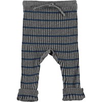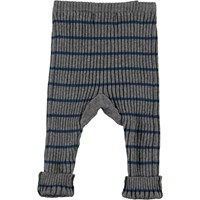 Sigmund is a pair of rib knit baby trousers in grey with narrow blue stripes. They have ties at the waist and can be rolled up at the legs.