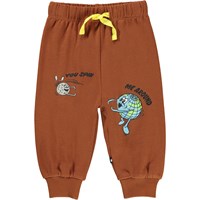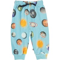 Simeon is a pair of light blue baby sweatpants with a print of planets. They have an elastic waist with ties.