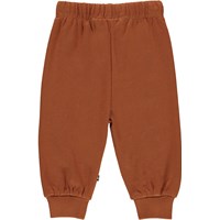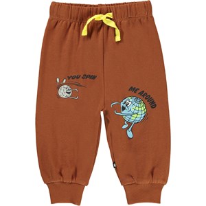 Simeon is a pair of brown baby sweatpants with a print of Earth and the moon, swinging each other around. They have an elastic waist with ties.