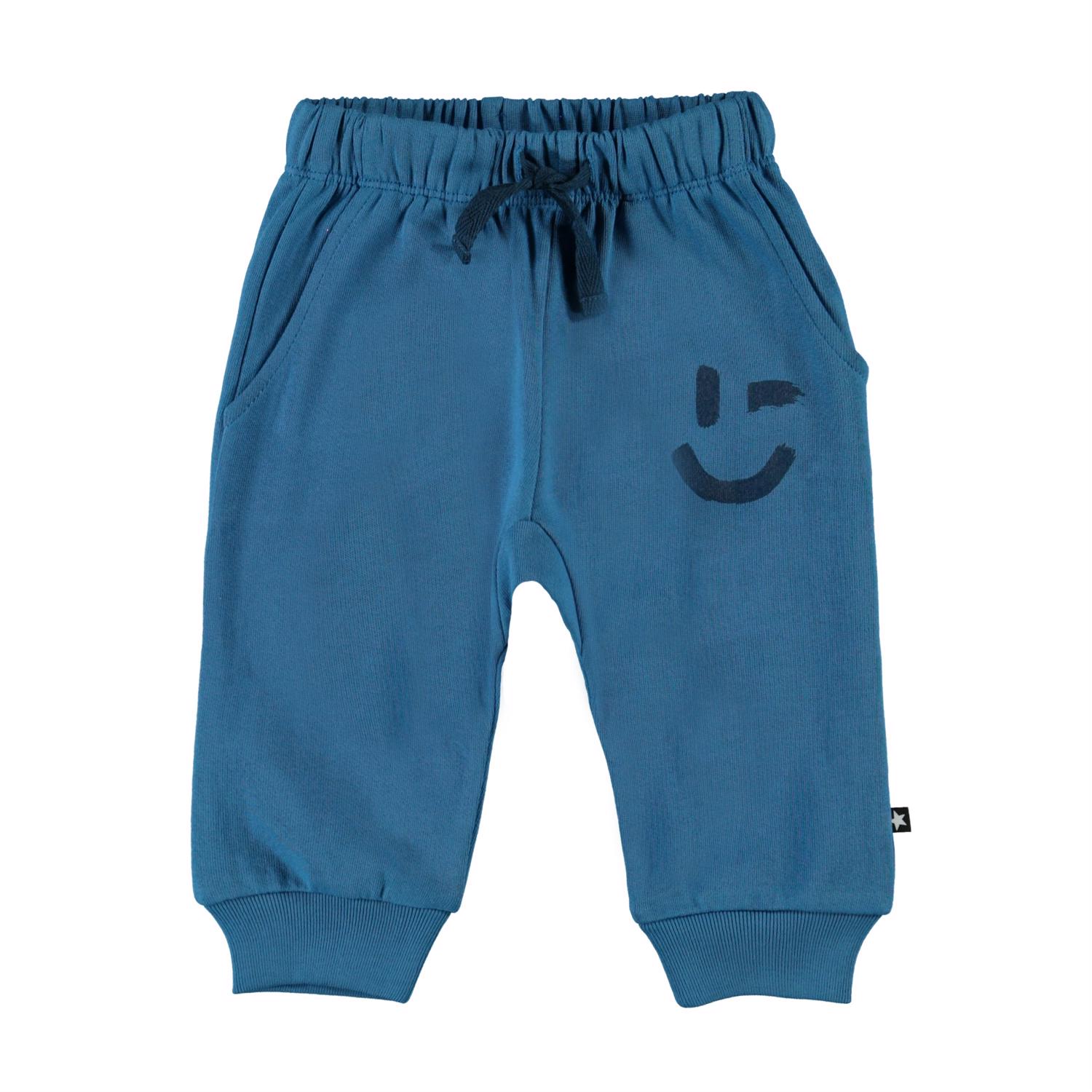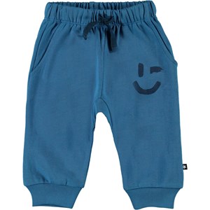 Simme is a pair of soft, comfortable baby trousers with a smiley face print. They have ties at the waist and side pockets.