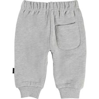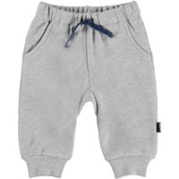 Simme is a pair of comfortable, light grey baby trousers in a thick fabric. They have ties at the waist and pockets at the sides and a single back pocket.