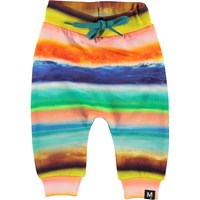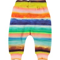 Solom is a pair of baby sweatpants in colourful sunset-coloured stripes. They have a wide elastic at the waist with blue ties and elastic at the legs.