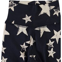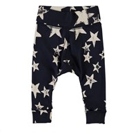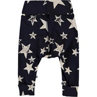 Son is a pair of dark blue baby trousers with a white star print.