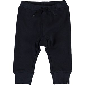 Stan is a pair of loose-fitting, dark blue baby sweatpants in a comfortable fit and with an elastic waist with striped ties. Stan is the perfect pull on pant and has a soft, brushed inner face as well as rib at the legs.