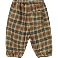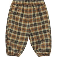 Brown plaid trousers for small children. These trousers are in 100% cotton, and they have elastic at the waist, side pockets and back pockets. Wear them with the matching Enoz top.