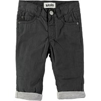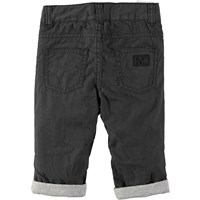Black baby trousers with grey roll up. The trousers have belt loops, snaps at the waist and front and back pockets.