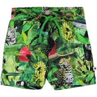 Simroy is a pair of blue baby shorts with the 'Fantasy Jungle' print that shows various animals that aren't normally found in a jungle. The shorts have an elastic waist with ties for a good, comfortable fit.