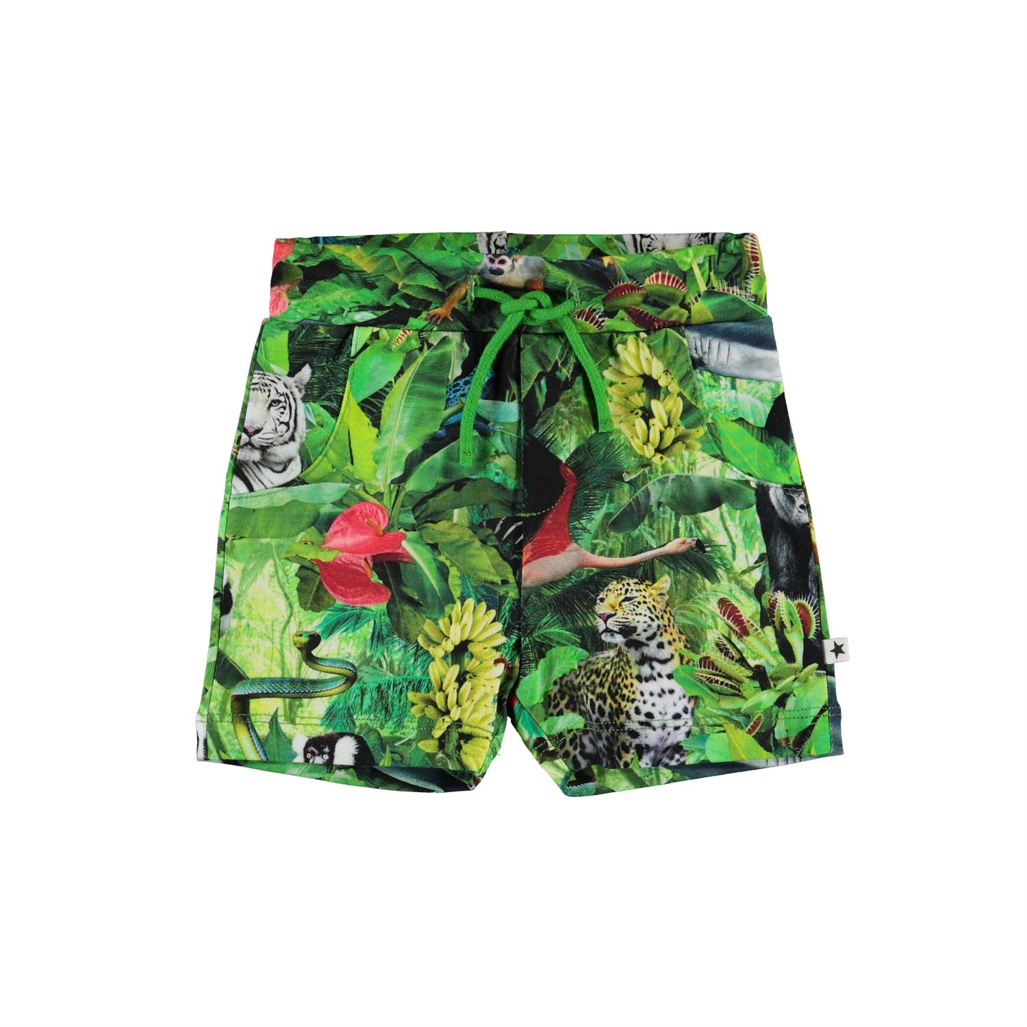 Simroy is a pair of blue baby shorts with the 'Fantasy Jungle' print that shows various animals that aren't normally found in a jungle. The shorts have an elastic waist with ties for a good, comfortable fit.