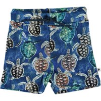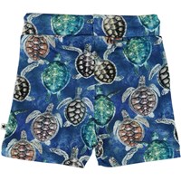 Simroy is a pair of blue baby shorts with a turtle print. The shorts have an elastic waist with ties for a good, comfortable fit.