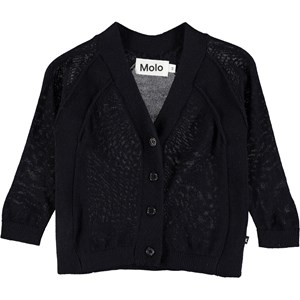 Sweet, finely knit baby cardigan in dark blue wool with rib edges, visible stitching and buttons down the front.