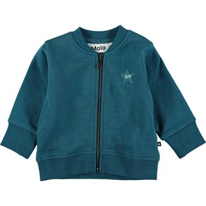 Derek is a blue/green baby sweatshirt with a zip front. It has a soft, brushed inner face with rib at the neck, sleeves and bottom. It has an embroidered star on the chest.