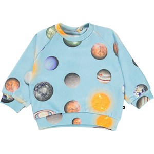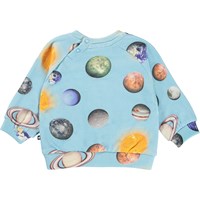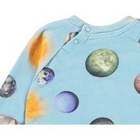 Disc is a baby sweatshirt in light blue with a print of planets. The sweatshirt has a snap back closure.