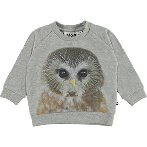 Disco is a baby sweatshirt in grey with an owl print on the front. It has a snap closure in the back of the neck.