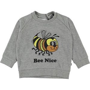 Disco is a baby sweatshirt in grey with a print of a bee and the text 'Bee nice'. It has a snap closure in the back of the neck.