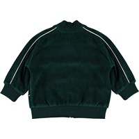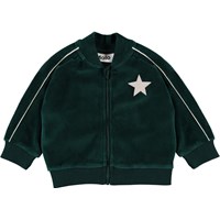 Dormo is a baby sweatshirt in green velour with a white star on the front and piping at the sleeves. It has a zip closure and rib at the sleeves, bottom and collar.