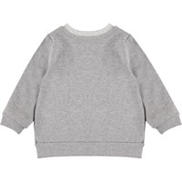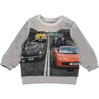 Drive is a grey baby sweatshirt with a print of a family of self-driving cars. The sweatshirt has a snap closure on one shoulder.