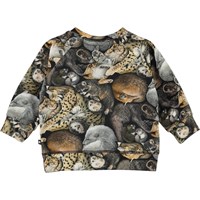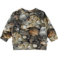 Elmo is a baby top with a print of various animals that are hibernating. Elmo has raglan sleeves and a round neck.
