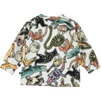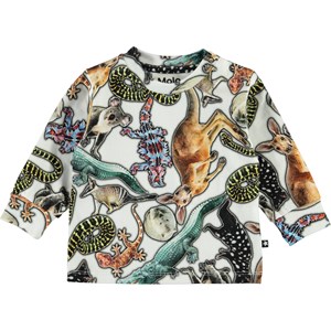 Eloy is a baby sweatshirt with an all-over print of Australia's wild animals. It has a snap closure on one shoulder.