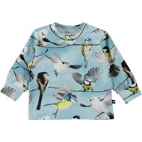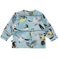 Eloy is a light blue baby top with a print of various birds. Eloy has an easy snap closure on one shoulder.