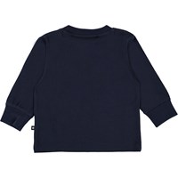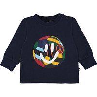 Eloy is a dark blue baby shirt with a print of a football with a smiley face on it. Eloy has a snap closure on one shoulder for easy dressing.